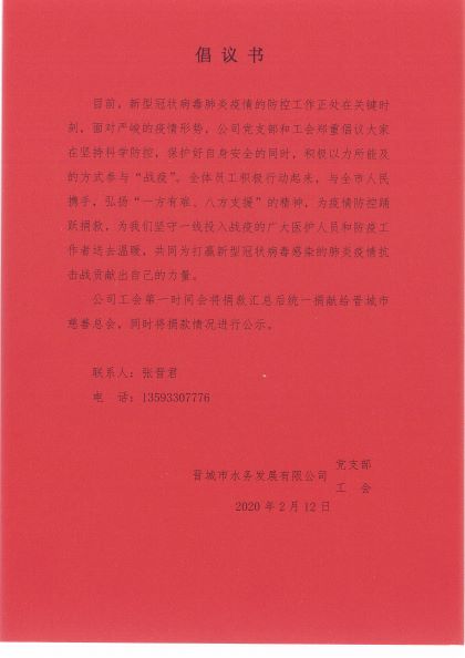 我公司黨支部成立“疫情防控志愿者服務(wù)隊(duì)”,配合公司所在社區(qū)進(jìn)行登記、管控、摸排等工作。不僅如此,公司黨支部和工會(huì)還聯(lián)合發(fā)出倡議書(shū),鼓勵(lì)全體員工積極為一線抗疫捐款,員工們積極響應(yīng),紛紛踴躍捐款,截止目前我公司共收到員工捐款10100元,工會(huì)有關(guān)人員已第一時(shí)間將員工捐款匯總并送至慈善總會(huì)。